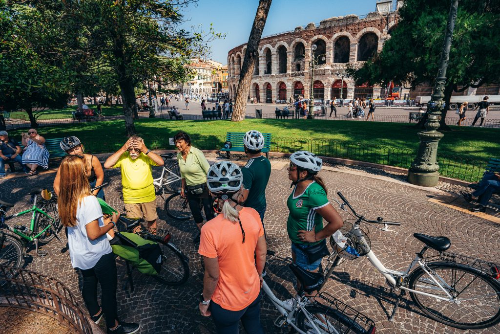 Monta in sella e segui la tua guida per le strade e le piazze principali di Verona. Durante questo tour scoprirai la città vivendola come molti veronesi: osservandola mentre andrai in bici, meravigliandoti della storia e respirando i tanti profumi che si diffondono per le vie del centro. La guida ti accompagnerà a scoprire i monumenti e i luoghi storici, raccontandoti la loro storia e aneddoti interessanti. Insieme agli edifici simbolo della città, scoprirai come erano le strade di un tempo, chi era e come viveva la famiglia che ha guidato Verona al suo splendore. Ti fermerai davanti all’Arena, al balcone di Giulietta, potrai riposarti un momento mentre la guida ti racconta dei magnifici edifici affrescati in Piazza delle Erbe e arriverai fino alla Chiesa di San Zeno, una delle più importanti sia come simbolo religioso della città, che per bellezza architettonica.